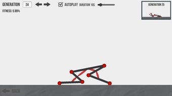 Evolution är en simuleringsprogram för att skapa varelser som skapats av Keiwan Donyagard. Mer av en experimentell simulator än ett spel som påminner om Spore-spelen, kommer denna app att få dig att bygga enklare varelser som kan springa, hoppa och klättra över hinder med bara leder, ben och muskler. Dina varelser får automatiskt en hjärna när du klickar på knappen Evolve. Och med kombinationen av ett neuralt nätverk och en genetisk algoritm kan de lära sig och förbättra sig i uppgifter helt på egen hand, så länge du konstruerar deras kroppsdelar på rätt sätt. Simulatorn kommer att välja det bästa av varje generation av dina varelser och låter dig bygga och förbättra dem med hjälp av de valda få som förinställda varelser du kan börja med. Som utvecklaren säger är Evolution inte mycket av ett spel eftersom det inte finns några prestationer eller spelarbelöningar, även om du skapar den bästa varelsen som kan klara alla uppgifter. Men det är fortfarande en utmanande varelsebyggare att prova på.